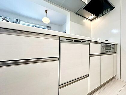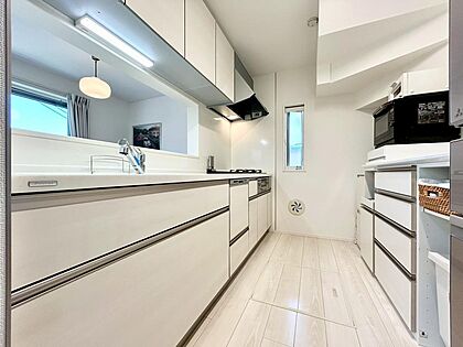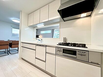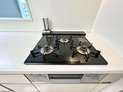 収納が充実したシステムキッチン!3口コンロもあり、調理スペースも確保され、広さも丁度良く使いやすいシステムキッチンになります!