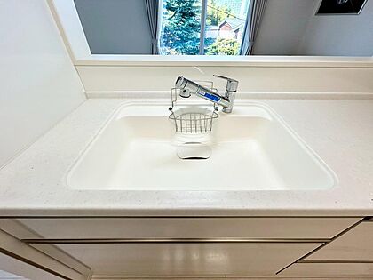シンクは広々、水切り、スポンジ置きも完備しており便利です。浄水器内蔵シャワーのため見た目のすっきり、水の購入の手間も省けます。