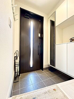 玄関の床から浮かせてフロートタイプの玄関収納です。足元にスペースがあることで実際よりも空間を広く見せます。また、背の高いトール型玄関収納でも圧迫感を減らしすっきりさせることができます♪