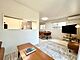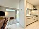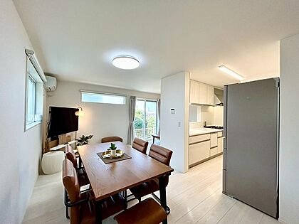約16.8帖のリビングダイニングキッチン。南向きで採光も良好、自然に光が入りくつろげる空間になりそうです。床もホワイト調で基調されており空間を広く見せています♪