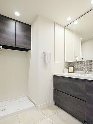 洗面室には洗面化粧台と吊戸棚、リネン庫があり、色数を抑えることでスタイリッシュな空間となっております。洗濯機置き場上の吊戸棚には洗濯グッズを収納することで家事の動線を活かすことができます。