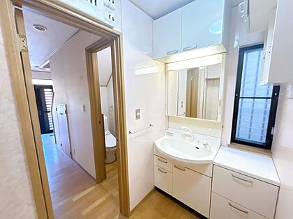 【洗面所】三面鏡の裏は全て収納になっております。洗面ボウルは底が平らなので、つけ置き洗いなどの家事にも活躍します。