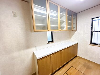 【カップボード】キッチンにはカップボードがございます。吊戸棚もあるので十分収納いただけます。