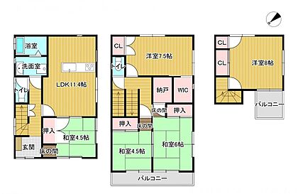 【間取り図】3階建5LDKのお家です。十分部屋数があり、全居室に収納がございますので、ご家族でも住みやすいですよ。