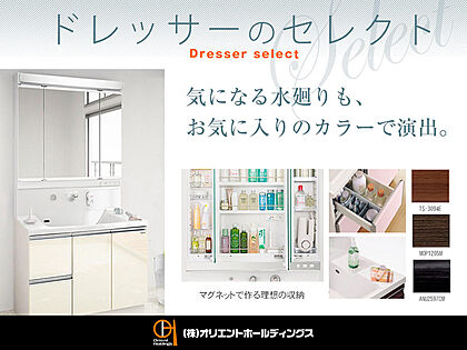【洗面化粧台】収納豊富なドレッサー。3面鏡付きで、毎朝の身支度もスムーズに。ほかにも数種類のカラーをご用意しておりますので、お好みに合わせてセレクト可能です。(建物価格1630万円、建物面積91m2)