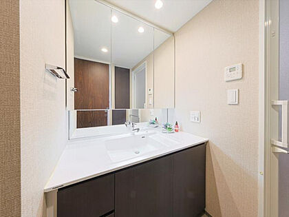 ■洗面化粧台は三面鏡になっており、カウンターとボウルに継ぎ目のない掃除のしやすい洗面台です!
