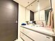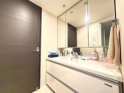 【洗面所】広い洗面台は朝の時間も並んで用意することが可能です。また三面鏡はすべて収納することも可能です。