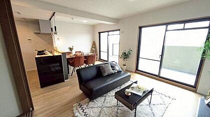 【リビング】南向きバルコニーから明るい陽射しが差し込むリビングルーム