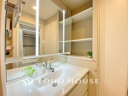 「すっきり片付く収納力。三面鏡洗面台。」身だしなみを整えやすい事はもちろんですが、鏡の後ろに収納スペースを設ける事により、散らかりやすい洗面スペースをすっきりさせる事が出来るのも嬉しいですね。