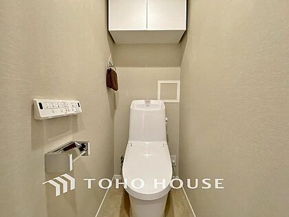 「温水洗浄便座付きトイレ」トイレは快適な温水洗浄便座付です。清潔感のあるホワイトで統一しました。いつも清潔な空間であって頂けるよう配慮された造りです。