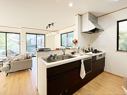 【Kitchen】食洗機が搭載されたシステムキッチン。開放的な設計で部屋全体を見渡すことができます。料理中でも家族とのコミュニケーションが取ることがででき、子供の様子も見れます。