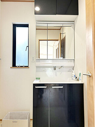 【Wash Room】機能美とデザイン性を両立させた3面鏡洗面化粧台。視覚的に広がり感を持たせるだけでなく、機能的にも優れています。