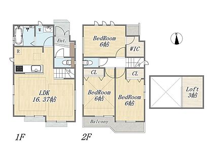 【区画図】車2台駐車可能!LDK16.3帖の3LDK!WICやロフト収納が備わった収納豊富なプランニング。TES式床暖房・食洗器・カップボードが標準設備!エアコンやカーテンレール網戸なども設置済み!