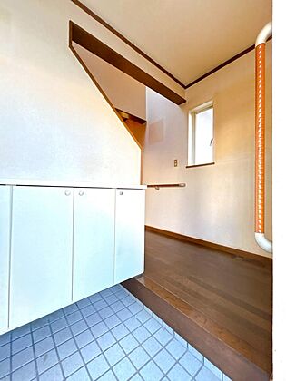 【リフォーム前写真】玄関内部の写真です。備え付けのシューズボックスは解体し終え、シューズクローゼットを設置いたします。照明交換・タイル張替え等を行います。
