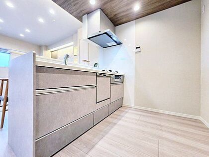 リビングと統一感のある対面式キッチン。3口コンロ、食洗機付と設備面も充実。