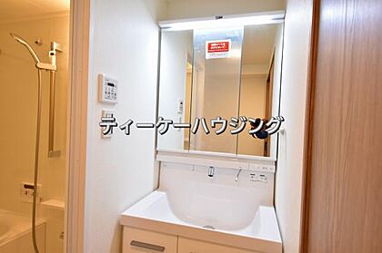 三面鏡の裏には収納がたっぷり。洗面室をすっきりきれいに使えます。
