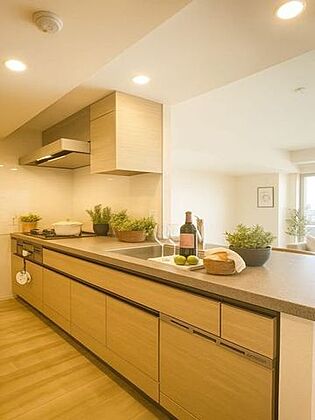 ふたり並んでも余裕のあるサイズ。家族の存在を感じながら料理が楽しめる対面式キッチン。
