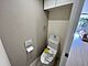 トイレットペーパーなどを隠してしまえる吊戸棚付き。温水洗浄便座で、日々の利用も快適です。清潔感を保てるシンプルな設計です。(2025年11月14日撮影)