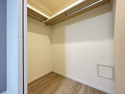 WIC付き7帖洋室:ハンガーパイプや棚を使い、衣類や小物類を効率よく整理できます。奥まで見渡せる設計で、毎日の準備もスムーズです。(2025年11月14日撮影)