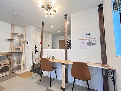 家族と猫の目線の高さが揃うリビング。 お気に入りの家具に触れ、愛する家族の存在を感じるたびに、心休まる空間。
