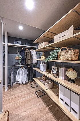 【DEN/約4.6帖】可動棚とオープンクローゼット、デスクが設けられています。ご家族分の衣類やバッグ類の小物はもちろん、季節家電やスーツケースなどがたっぷり収納できます。
