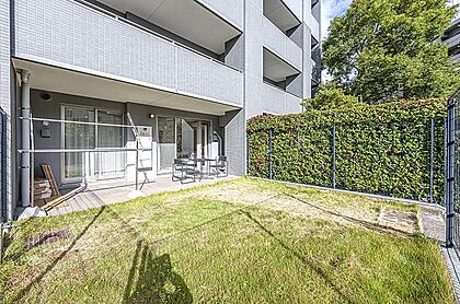 【専用庭】専用庭に加え、マンション敷地内は手入れの行き届いた植栽が施され、四季を感じる暮らしが叶いそうです。来客用の駐車場やレンタサイクルの利用もできます(一部有償)。