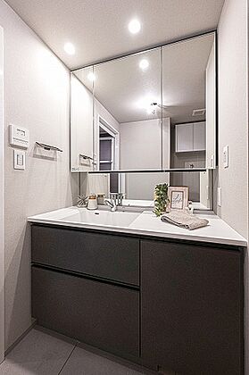 【洗面室】身支度に便利な3面鏡とミドルミラー付きの洗面化粧台。鏡の裏やボウル下に収納が備わっているので、ドライヤーや化粧品類が片付きます。