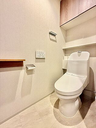 温水洗浄便座♪吊戸棚付きにつき、トイレットペーパーなどの収納にも安心です♪