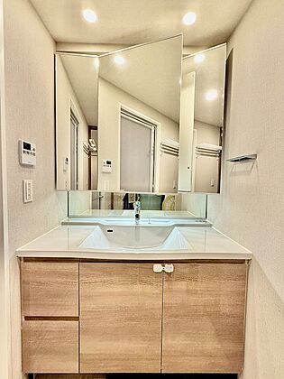 毎日朝のお仕度が楽しくなる三面鏡付の洗面台♪体重計も足元にしまうことができます!