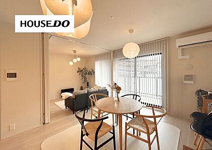 大きな窓から明るい陽射しが差し込むリビングダイニング。開放的な空間設計で、家族みんながくつろげる住まいです◎バーチカルブラインドも付いてきます!※売主様の家具付き写真