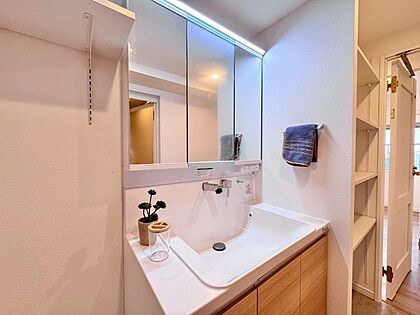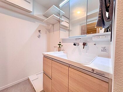 鏡で朝の身だしなみもくまなくチェック。清潔感溢れるスタイリッシュなデザインの洗面化粧台。
