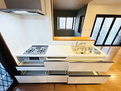 収納スライドをぐっと開けばお鍋や調味料をどんどんしまえる大収納。キッチンはいつもキレイ。