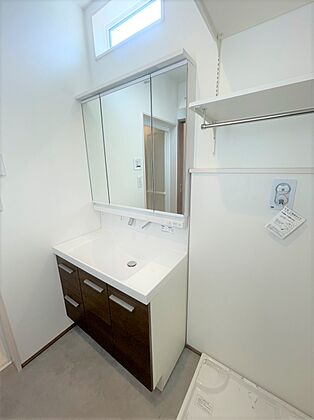 洗面台は三面鏡で広さも十分!お化粧品・歯ブラシもしっかり収納できる鏡裏収納タイプです! 室内(2025年11月)撮影