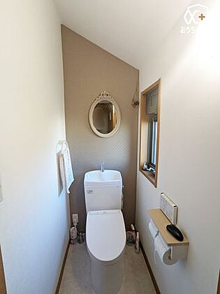 1階温水便座付きトイレの様子。小窓を空ける事で換気もしやすく、明るいトイレです!お手入れが楽なタンクレス!