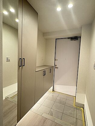 フロートタイプの下足入が備わった玄関。間接照明が足元を照らしてくれます。廊下にも物入がございます。【玄関】