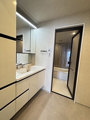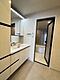 洗面室に収納が備わっており、収納家具を設置する手間が省けます。お子様に嬉しいミドルミラー付き。【洗面室】