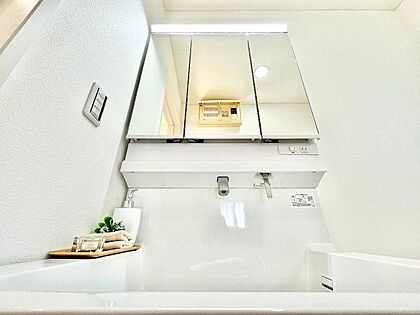 三面鏡の付いた洗面化粧台は、鏡面裏側にも機能的な収納を配置。スキンケア用品などが収納できます。