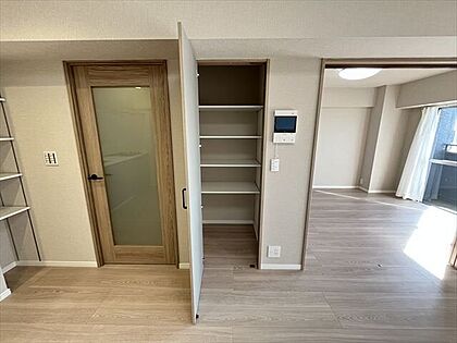 壁付けキッチンで、調理に集中しやすく、水はねや油はねも飛び散りにくいです◎キッチン横にはパントリーを完備。食品や生活用品のストックもスマートに保管しておくことが出来ます。