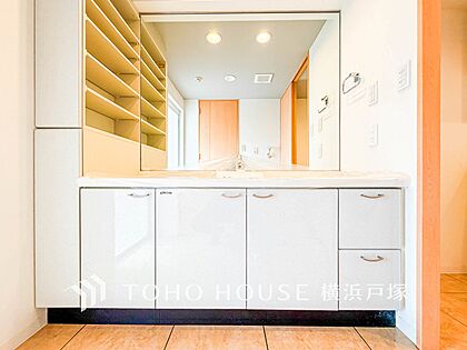 【Powder room】十分な大きさの洗面台は、身だしなみチェックや歯磨きなど、朝の慌ただしい時間でも余裕とゆとりを感じて頂けます。