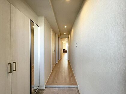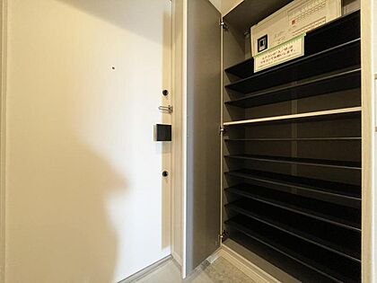 【玄関】 鏡のついたシューズボックス。お出かけの際に身支度のチェックもできます天井まであるシューズボックスはご家族分の収納でき収納力に優れています