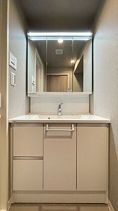 •  洗面台には三面鏡を採用。身だしなみを整えやすい事はもちろんですが、鏡の後ろに収納スペースを設ける事により、散らかりやすい洗面スペースをすっきりさせる事が出来ます!