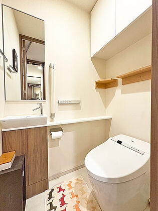 節水型タンクレストイレ独立型手洗器付き!吊戸棚の収納もついております。