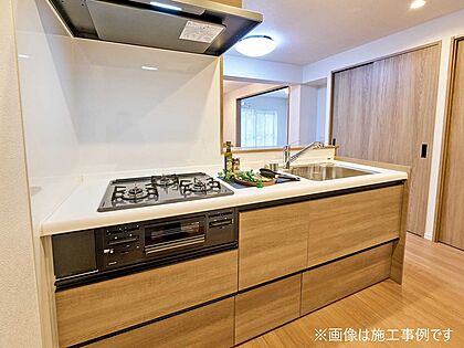 画像は施工例 約13.4帖のLDK、角住戸で明るいLDK