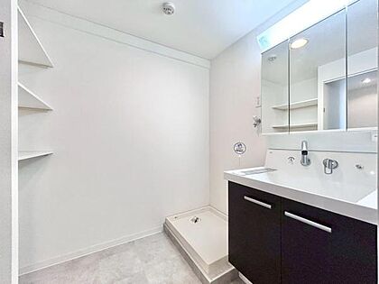 明るく、清潔感のある洗面所♪鏡も大きく使い勝手の良い洗面化粧台です♪収納棚がありますのでタオルや洗剤などまとめておけます!