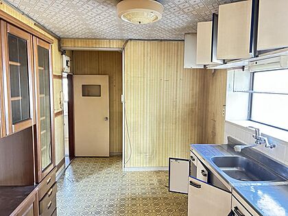 【リフォーム予定】ダイニングキッチンの様子です。新品のシステムキッチンが入ります。クロス・クッションフロア張替え、照明交換します。