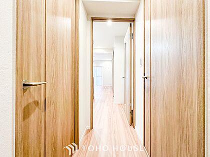 上質感漂う廊下。居住者の帰り、訪れる方を優しく迎える・安らぎに満ちた生活空間を予感させる。