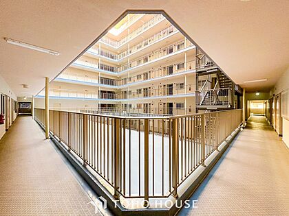 開放的で明るい共用廊下。清潔感があり、行き届いた管理体制がうかがえます。
