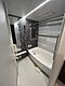 グレーのストライプ壁と大理石調パネルが上質感を演出。窓からの自然光と機能的な設備が、快適で洗練されたバスタイムを叶えます。