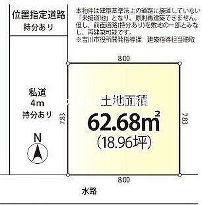 【接道】 ( 私道 西 4m ) ※オーナーチェンジ物件につき、現賃貸借契約引継ぎが条件です。表面利回り9.00%。 ※契約不適合責任免責 ※建築基準法上の道路に接道していない「未接道地」となり、原則再建築できません。但し、前面道路(持分あり)を敷地の一部とみなし、再建築可能です。(吉川市役所開発指導課 建築指導担当聴取) |
