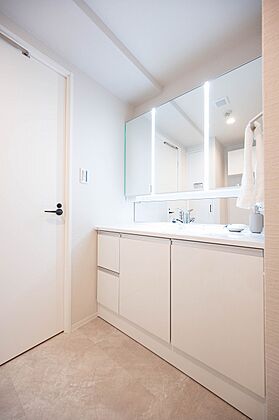 身だしなみを整えやすい、三面鏡・シャワー付き洗面化粧台です